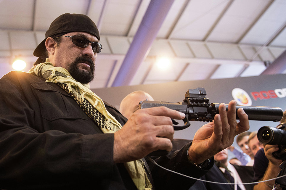 Знаменитый американский актер Стивен Сигал с самозарядным пистолетом Сердюкова с глушителем во время посещения международной выставки "Оборонэкспо-2014"