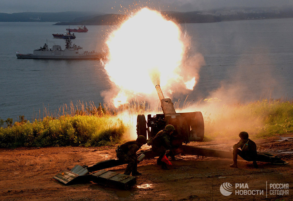 Артиллеристы бригады морской пехоты Тихоокеанского флота РФ приветствуют салютом индийские корабли