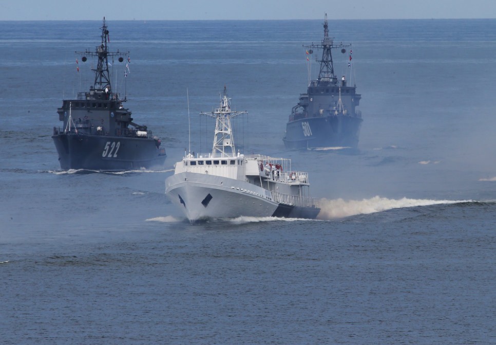 Катер радиохимической разведки (на первом плане) и базовые тральщики БТ-213 "Сергей Колбасьев" (слева) и БТ-212 (справа) во время генеральной репетиции военно-морского парада, посвященного Дню ВМФ