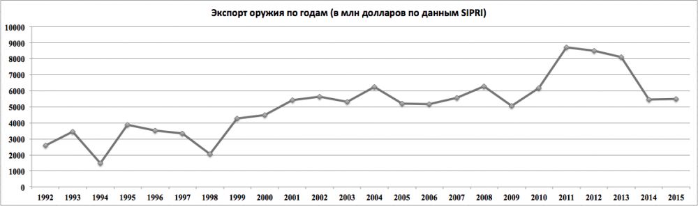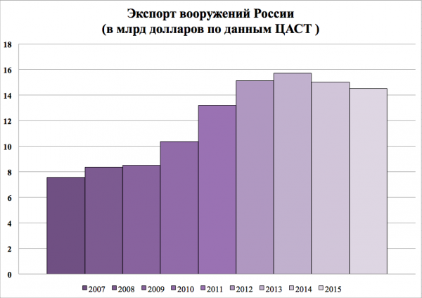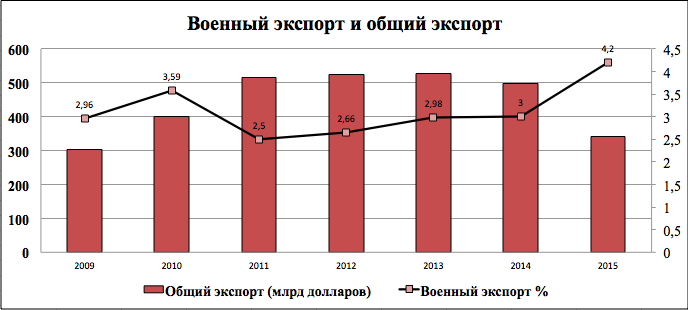 В 2015 году доля военного экспорта в общем экспорте увеличилась почти в полтора раза – теперь на него приходится 4,2% всей внешней торговли, которая в целом в предыдущем году сократилась более чем на 30%.