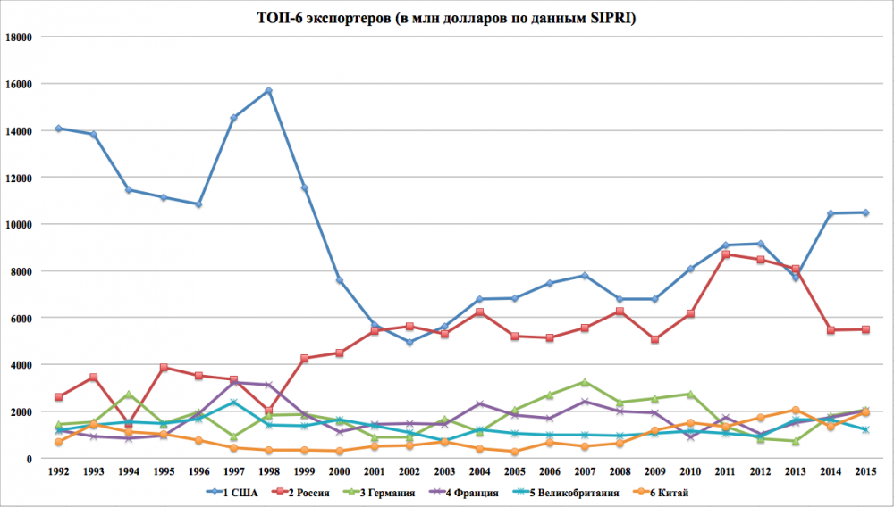 Куда более удивительной выглядит тенденция снижения экспорта России в Китай, хотя в 2015 году ситуацию удалось немного сгладить. К сожалению, приходится констатировать, что обычная китайская практика «купил-скопировал» имеет место быть: так, мы в 90-х уже потерял место на рынке дешевого вооружения, переквалифицировавшись на поставки высокотехнологичной продукции. А если взглянуть на график ТОП-экспортеров выше, то можно увидеть, что Китай медленно, но верно наращивает свои объемы продаж.