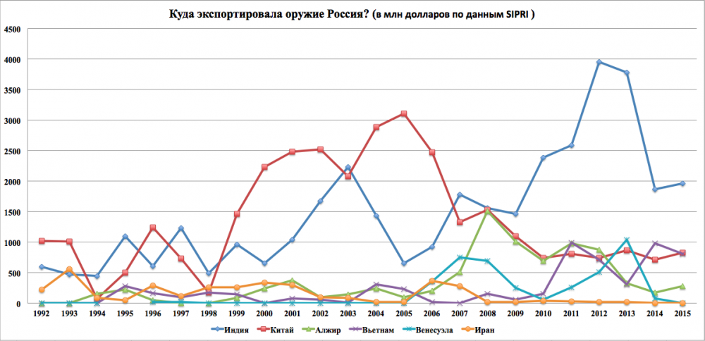 Среди главных импортеров российского оружия вполне ожидаем лидирует Индия, объем торговли с которой начал резко оживляться после трудных 90-х и не менее трудного для индийско-российских отношений периода первого десятилетия XXI века.