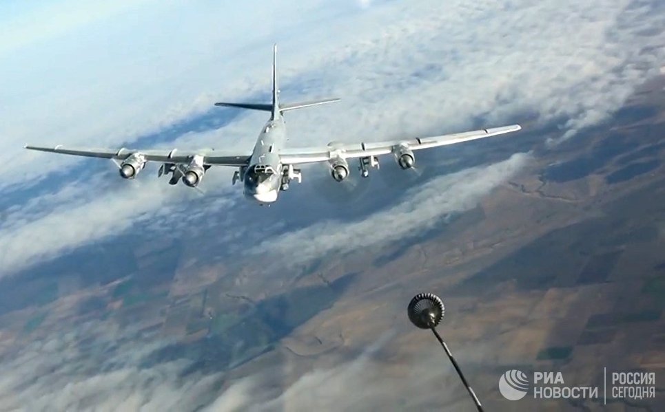 Дозаправка в воздухе стратегического бомбардировщика-ракетоносца Ту-95МС во время выполнения боевой задачи по нанесению ударов крылатыми ракетами Х-101 по объектам террористов в Сирии